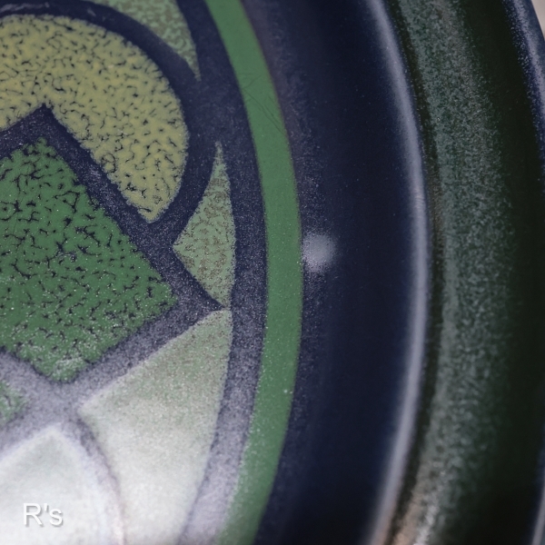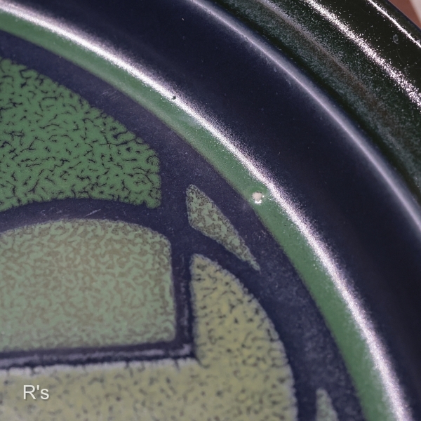 グリーン系の幾何学模様がレトロでかわいい丈夫な大皿です。