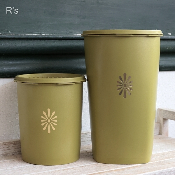 タッパーウェア デコレーター2個セット 丸型保存容器 3.7L&1.9L 柄付き オリーブグリーン ユーズド品 (TP6245)