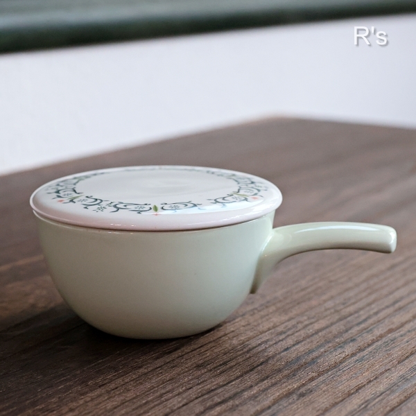 淡いグリーンが素敵な持ち手・蓋付き容器です。
