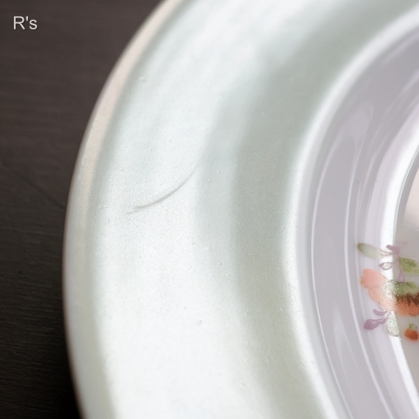 縁周りは淡いグリーン、中には様々なお花が描かれた素敵な大皿です。